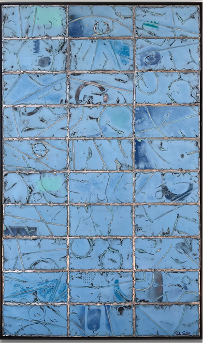 This very interesting piece is made of metal, aluminum to be exact, mounted on a large wood panel, with a black floating wood frame. The aluminum "tiles" have been distressed (bent, dented, scratched) and painted with several layers of enamel paint. Then the paint is sanded to expose the layers of paint as well as the metal. Look closely, the edges of each of the 30 pieces are exposed metal. It is really quite cool in person. The variations of blue along with the distressing and exposed metal make this piece very dimensional. The wood panel has a black floating frame so the metal is slightly recessed from the frame edge. The size of this piece is 25" x 41" x 1.5". It weighs approximately 8.5 pounds. It has a regular hanging wire on the back and is ready to hang.